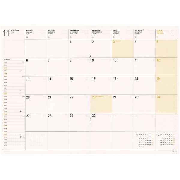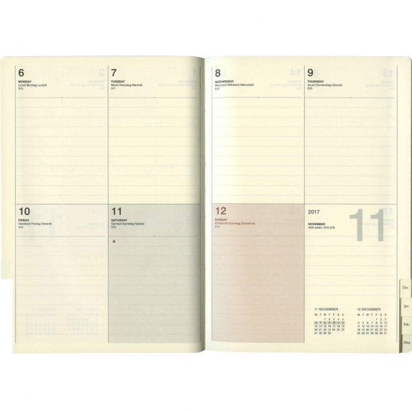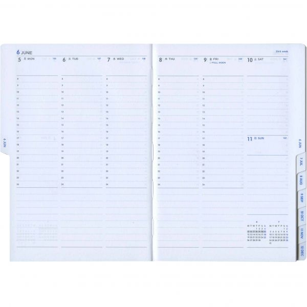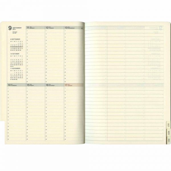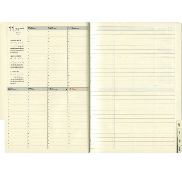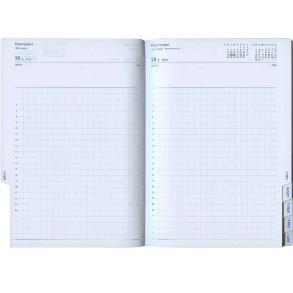 布製カバーに対応年の数字を配したシンプルなデザイン。目にやさしいクリーム紙、ページの検索がしやすいカットインデックスを採用。片面1週間バーチカル+片面メモのバーチカル・レフト・タイプ。