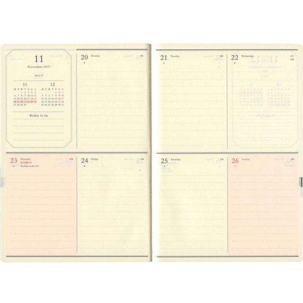 メモなどの収納に便利な大きめのクリアポケットが特徴。さりげないゴールドのアクセントが上品です。自由度の高い週間ブロックレイアウトを採用。