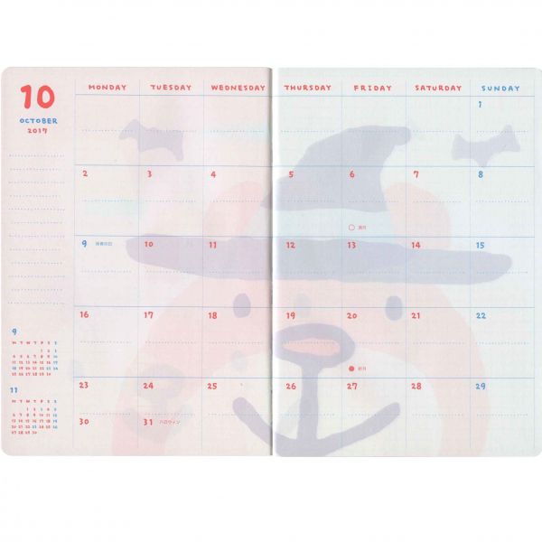 マジックテープ式のフラップに、前面のクリアポケットが特徴。キュートな動物のイラストが描かれた紙は取り外すことも可能です。中のフォーマットは書き込む際に自由度の高い週間ブロックタイプ。