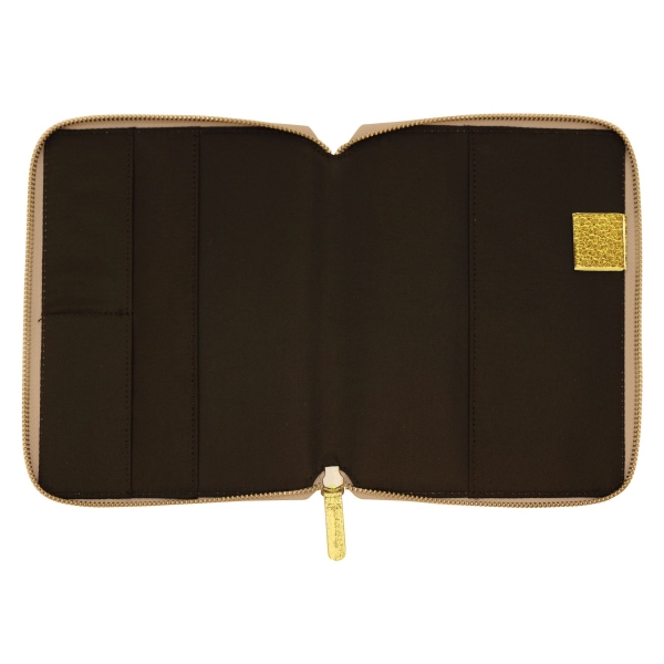 メモなどの収納に便利な大きめのクリアポケットが特徴。ゴールドのタイポグラフィとコーナー金具が上品です。
