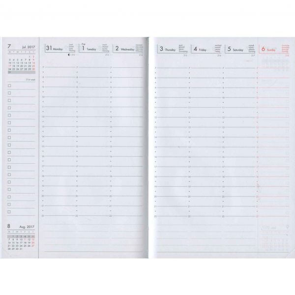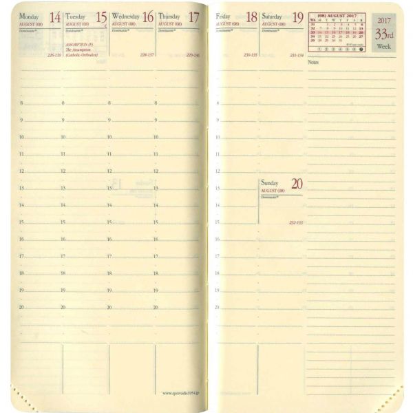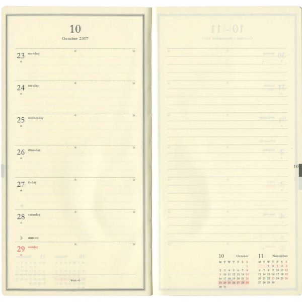 封筒の形に模した品の良い雰囲気の手帳。合皮製ですが本物さながらの質感としっとりした手触りで、上質さを感じさせてくれます。見開き左側に週間ダイアリー、右側に縦開きのメモパッドがセットされています。