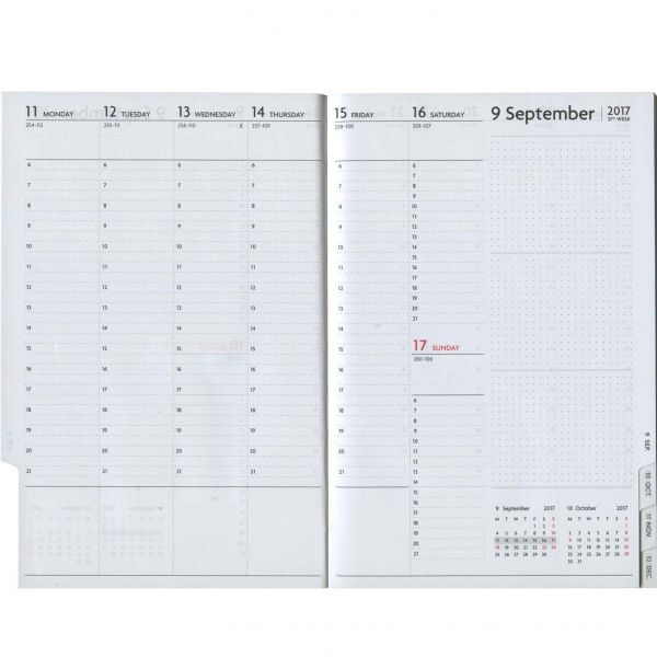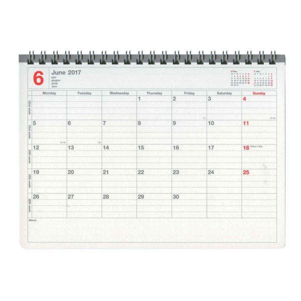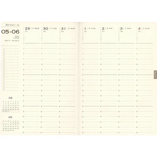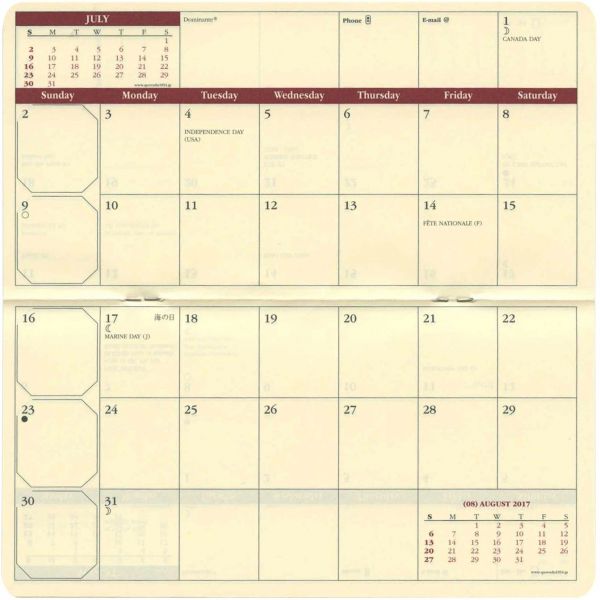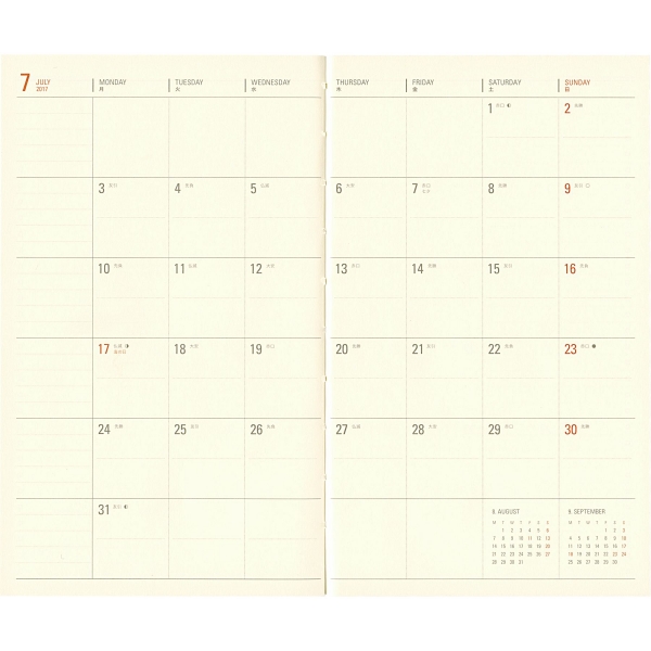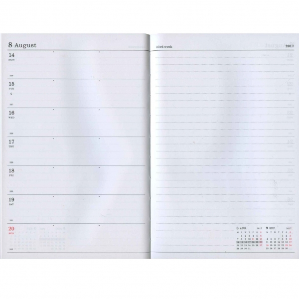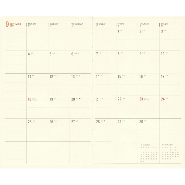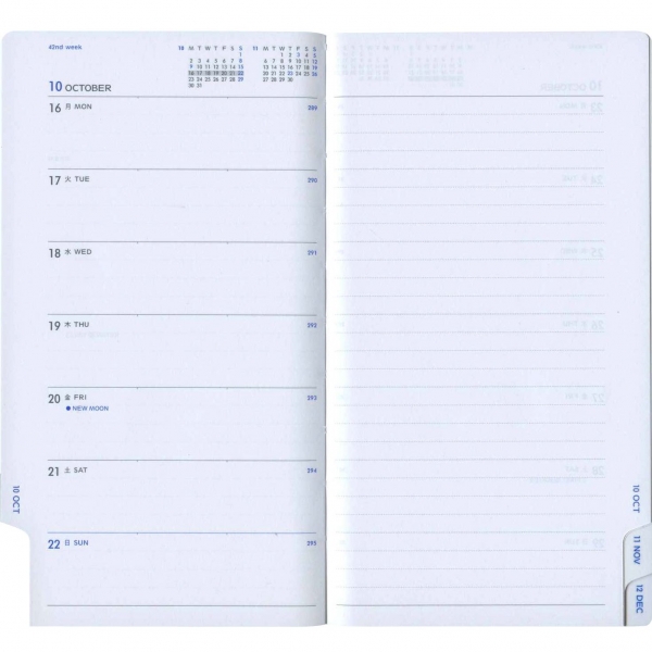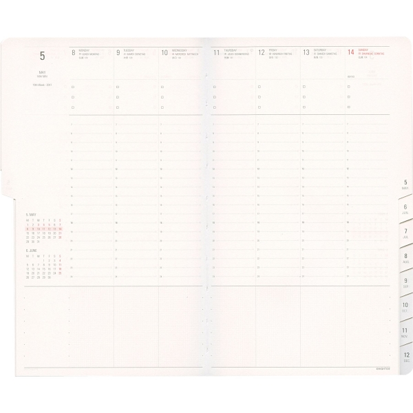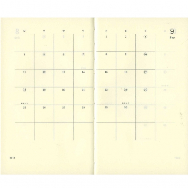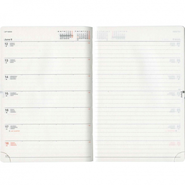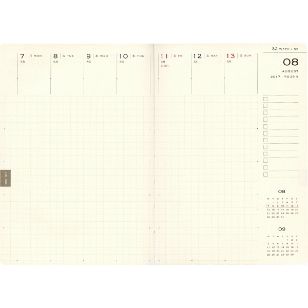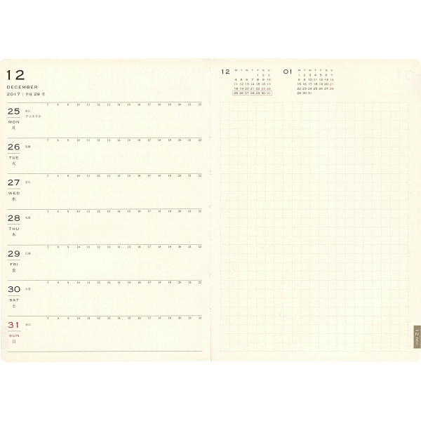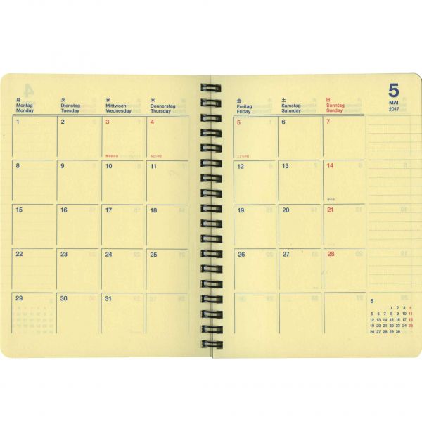 「リング綴じ」「厚紙表紙」「ゴムバンド」「ミシン目入りの用紙」「(ページの最後に綴じられた)PPポケット」といった、特徴的な仕様で知られるアイテム。シンプルな月間フォーマットと、沢山の方眼メモページでノートの様にお使いいただける手帳です。
