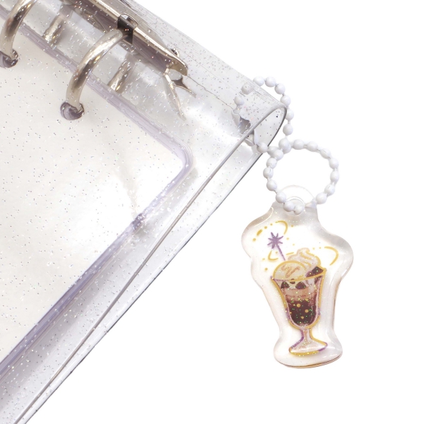 A6サイズの手帳型シール帳。ファスナー付きポケット2枚と貼ってはがせるクリアシート10枚入り。 スナップ式のベルトはやや長めで、立体シールを綴じられます。「喫茶アラモード」柄のアクリルチャーム付き。