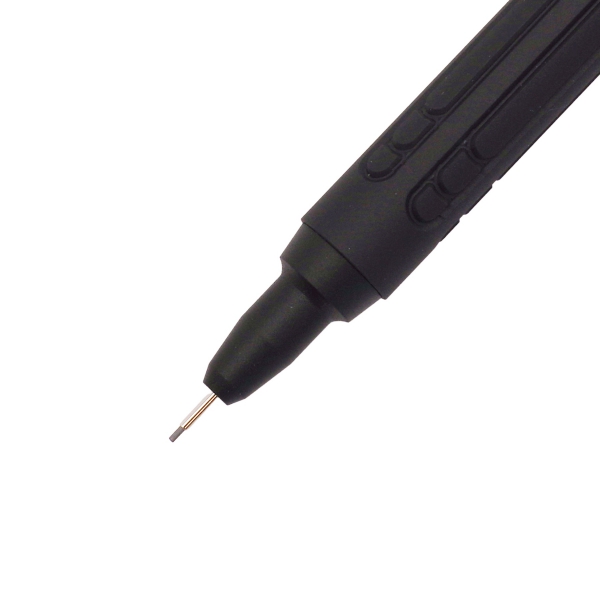 手にフィットする曲線的なボディと滑りにくいグリップが特徴のシャープペンシル。本体軸が人差し指の根元に当たる部分が僅かに反り削られているため、手にフィットして持ちやすく、洗練された印象を与えます。