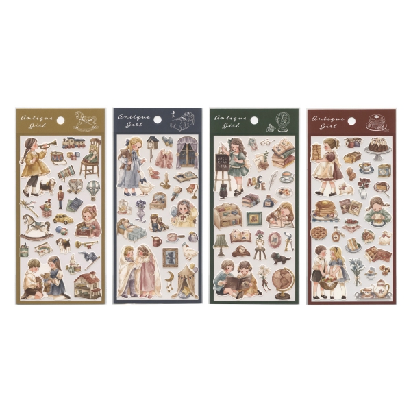 アミステッカーで大人気の「アンティークガール」のシートシールです。世界観を楽しめるモチーフピースと、男の子とセットのピースが追加されました。