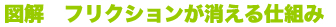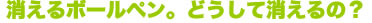 パイロットさんの創り出した夢の「消えるボールペン」。 ながい間、消えるボールペンは「消しゴムで消せる」ボールペンでした。 しかし、フリクションにおいて「消える」という意味は従来の「消せる」とはまったく異なっています。 消しゴムで消すというのは、紙の上のインクを削りとるということです。 そのため、筆跡の溝に入ったインクまで消すことが出来ず、擦れば擦るほど書類も痛めてしまいます。 フリクションは、ある温度になると無色に変わるインクを利用したボールペンです。 そのため、筆跡をペンのお尻についたゴム(消しゴムではないのです!)で擦って温度をあげると消えるのです。 温度を感知して消えるわけですから、筆跡の溝に入ったインクも美しく消えます。 温度を上げるためのゴムは消しゴムではありませんから、消しカスは出ません。 ※公文書、契約書にはご利用できません。 |