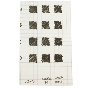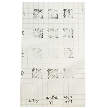 D、普通の砂消し 「Vコーン」「ユニボールアイ」は、やや色が残ってしまいました。「スタビロポイント」は比較的キレイに消えました。 |