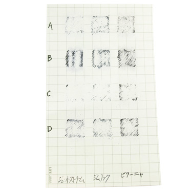 A、ハイパレイザー インクの粘度が低く、書いたインクが紙に染み込んでいるので、かなり力が必要なのですが、消しゴムが柔らかいのでうまく力を伝えられず、3種類ともやや苦戦。 |