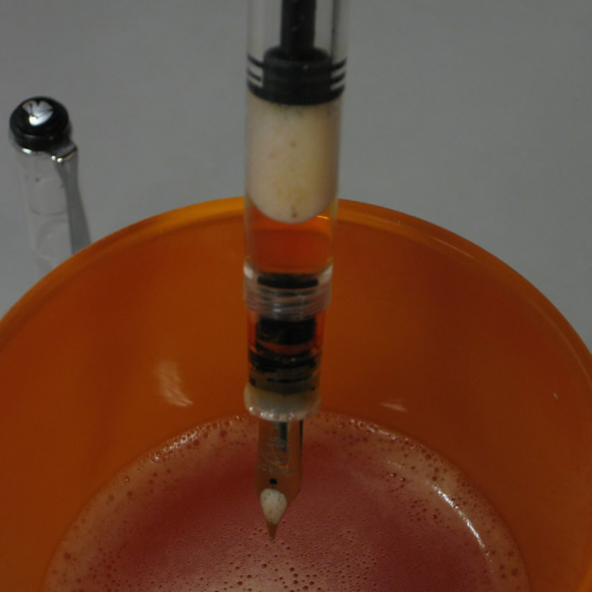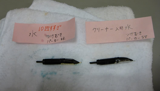 実は、今回のクリーニング液は顔料インク(カーボンインク)洗浄にも対応しているようで、実験結果をご報告させていただきたかったのですが、実験材料である「カーボンインクが乾いて固まってしまった万年筆」の乾燥が間に合わず用意することが出来なかったのです。