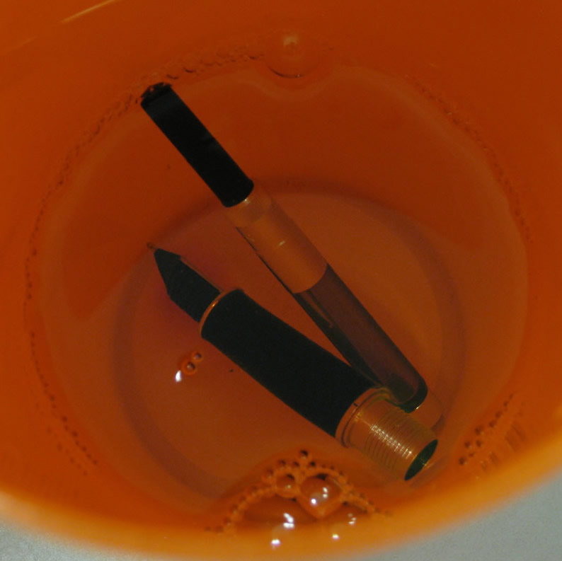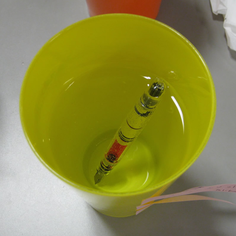 万年筆は通常、水につけてインクを溶かし、すすぐという方法で洗浄を行います。