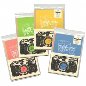 カメラをモチーフにしたレターセット。レンズ部分が透明フィルムになっており、中から山のイラストが描かれた便箋シートが覗きます。カメラバッグの形を模した封筒裏面に、宛名ラベルを貼ってご使用下さい。