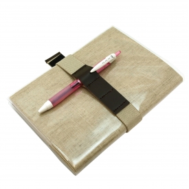 マジックテープで長さの調節が可能なブックバンド。ベルトはゴム製なので伸縮性があり、着脱も簡単です。レザー部分はペンホルダーになっており、太さ12ミリ程度までの筆記具3本挿すことができます。