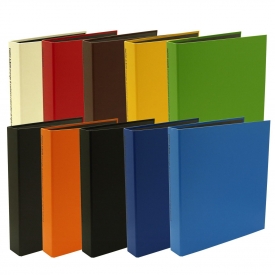 レザービニールクロスを使用した、4穴Dリングタイプのバインダー。厚手の表紙は丈夫で汚れに強く、レザー調の風合いが上品さを与えています。