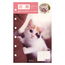 ミドリ/デザインフィルさんの2013年版、システム手帳リフィルです。犬や猫など、かわいい動物柄が素敵です。表紙だけでなく中のリフィルのページにも描かれているので、ページをめくるのが楽しみになります。でも、実は「オジサン」柄リフィルの人気も侮れないです。ひょうきんなオジサンを見ていると、それだけでおもわず笑顔になってしまいます。