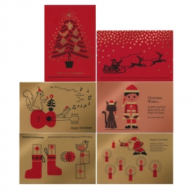 暖かみのある手書きのタッチと鮮やかな色合いで描かれたイラストポストカード「クリスマス柄」です。きらびやかなゴールドペーパーに発色の良いルビーレッドとマットブラックで印刷されています。