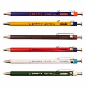 レトロな配色がかわいいPENCOの木軸筆記具。オールドアメリカンなテイストのロゴもオシャレに仕上がっています。ボールペンは油性の0.7mm、シャープペンは0.5mm芯を使用しています。
