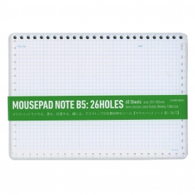 マウスパッドとメモの機能を兼ね備えたB5サイズの26穴ノートパッド。PCを操作していて、咄嗟にメモを取りたいときに便利なアイテムです。定規目盛り付きなので、デスクに定規が見当たらないときも安心。