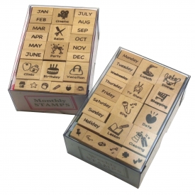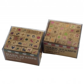かわいい木製のスタンプです。ハッピーでラブリーな毎日をイメージさせるアイコンのスタンプが、30種類入っています。