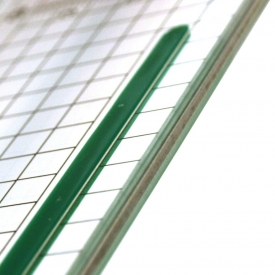 ゴム製のストッパー付きカッティング定規。裏面に仕込まれた滑り止めラバーが、しっかりと定規を固定してくれます。端にアルミ製のエッジが取り付けられているため、刃で定規を傷つける心配がありません。