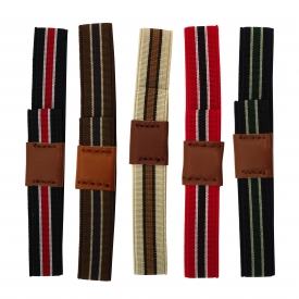 ストライプ柄のアクセントが付いた手帳バンド(ブックバンド)です。手帳・ノートと筆記具をまとめて持ち運ぶことができ、また、カバンの中で開いてしまうのを防ぐことができます。