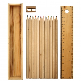 木製のペンケース付き、色鉛筆セット(12色)です。定規、鉛筆削り、ペンケース、色鉛筆。トータルで木の温もりを感じることができます。