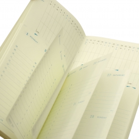 上質なデザインのフリーダイアリーです。布貼の表紙は肌触りが良く、毎日の日記をつけるのが楽しくなります。また、ハードカバータイプなので、表紙も折れ曲がりにくく丈夫です。