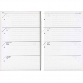 いつからでも始められるフリータイプの週間日記です。見開き1週間タイプ。小口部分にも色が付いているので、カラフルでオシャレ。見開きの右下部分は、メモペースになっています。