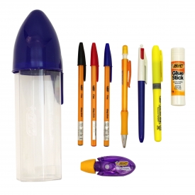 ペン型のケースに文房具が詰まったセット。ビックオレンジ(油性ボールペン0.7mm)黒・赤・青、2色ボールペン(黒・赤)、蛍光ペン(黄)、シャープペンシル、スティックのり、修正テープが入っています。