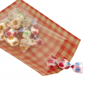 前面は透明のシート、後面はかわいらしい柄の紙でできた「中身が見える」袋。内容を見せて包装したいときに重宝します。12枚入り。