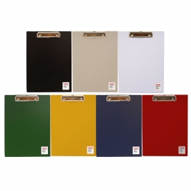 塩ビ素材を使用した、シンプルで丈夫なA4サイズ用のクリップボード。表面には皮革調の加工が施されており、マットで落ち着いた雰囲気に仕上がっています。