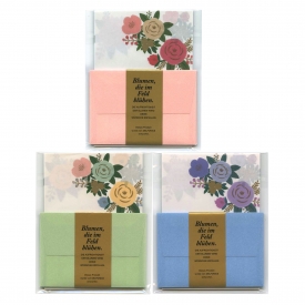 優しい色合いの花のイラストがあしらわれたレターセット。便箋の絵柄は3種類あり、重ねると下地の柄がうっすら見えて花畑のような表情になります。