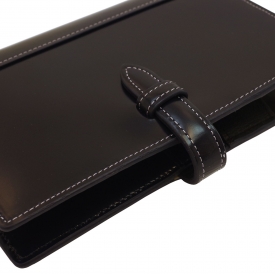 奥行きのある色合いが美しいガラスレザー(本革製)を使用した、端正なたたずまいのシステム手帳バインダー。ガラスに革を張り付けて乾燥させる独特の製法により、柔らかな光沢を放つ美しいツヤ感を実現しました。