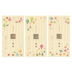 少しクリームがかった美濃和紙に、ハンコのような淡い色彩のイラストをあしらった、優しさと温もりを感じさせるシリーズです。一筆箋、便箋、封筒(いずれも別売り)がございます。