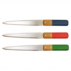 刃渡り約11.5cmのステンレス製レターオープナー(ペーパーナイフ)。使い勝手の良い大きさです。柄の部分には木目の美しいオーク材を使用。色鮮やかな塗装が目を引きます。紙箱入り。