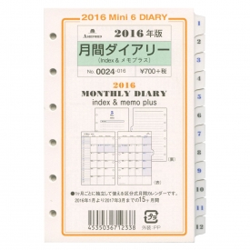 【Ashford/アシュフォード】2016年版 ミニ6穴サイズ 月間ダイアリー index&メモプラス システム手帳リフィル