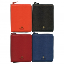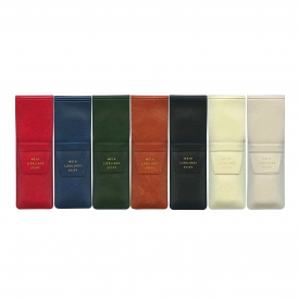 シボ加工の施されたPVC素材に、ゴールドの箔押しが施されたクラシックな雰囲気の漂うペンシース。必要最小限の筆記具を持ち歩くのに適したスリムな形状です。