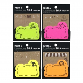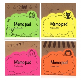 四角いクラフト用紙と、型抜きされたふきだしのイラスト入り蛍光色用紙が30枚ずつセットになった、かわいいメモパッド。下部で天のり製本されており、どちらでもお好きな方から使用することができます。