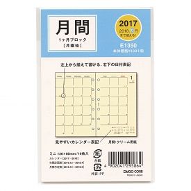 ダイゴーさんの2017年版システム手帳リフィルです。週間ページ(ホワイト用紙)と月間ページ(クリーム用紙)が色で分けられており、見分けやすいです。