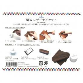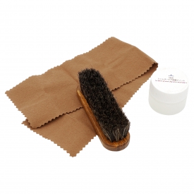 革製品のお手入れにお使いいただける、木製レザーケアブラシ、保護、艶出し用のミニクリーム、クリームを塗布するためのケアクロスのお得な3点セットです。