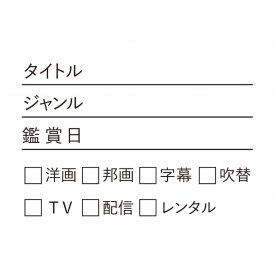映画・ドラマ鑑賞を記録するスタンプ。タイトル、ジャンル、鑑賞日を記入できます。洋画、邦画、字幕、吹替、TV、配信、レンタルの項目にチェックを入れて視覚的に分かりやすく情報を記録できます。