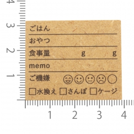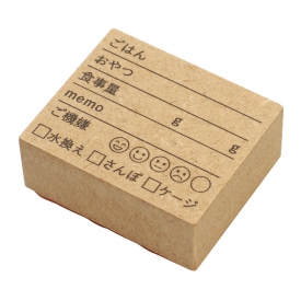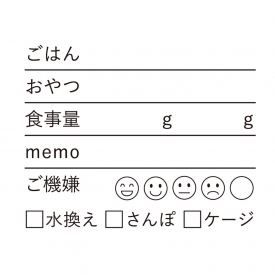 愛猫や愛犬などの生き物の飼育記録のスタンプです。ごはん、おやつ、食事量、メモ、ご機嫌を記入でき、水換え、さんぽ、ケージ(掃除)をチェックできます。手帳やふせんなどのメモに押しやすいサイズ感です。