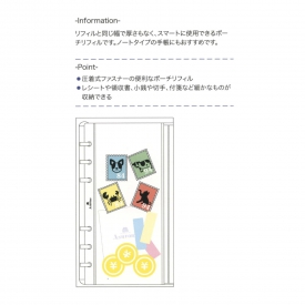 リフィルと同じ幅で厚さもなくスマートに使用できるポーチリフィルです。レシートや領収書、小銭や切手、付箋など細かなものを収納するのに便利です。ベルトやファスナーの無いノートタイプの手帳にもおすすめです。