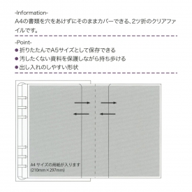 A4の書類を穴を開けずにそのままカバーできる2つ折りのクリアファイルです。A4サイズ用紙を折りたたんでA5サイズとして保存できます。