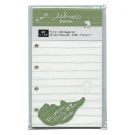 用紙は書き心地の良いトモエリバーを採用。フリーハンドで描かれたような、だいたい合っている、横罫だいたい7mmのM5サイズのリフィルです。5パターンの絵柄が各10枚ずつ入っています。