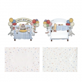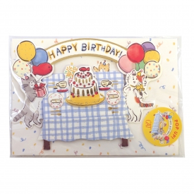 送って、飾ってかわいい、バースデーポップアップカードです。テーブルを囲んでバースーデーのお祝い!賑やかなシーンがミニチュアのように立体になります。テーブルの下部分にメッセージ欄があります。