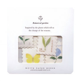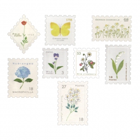 様々な切手型の野の花が描かれたマスキングテープ素材のフレークシールです。花のモチーフを水彩絵の具で仕上げています。アジサイ、スズラン、ヒナゲシ、ヴィオラ、カモミール、センニンソウ、ワイルドストロベリー、キタキチョウ8種類のシールが入っています。