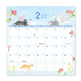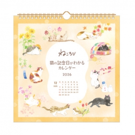 水彩の優しいタッチで、かわいらしい仕草の猫たちが季節の花々や風物詩と描かれている壁掛けカレンダーです。猫好きにはうれしい猫の記念日が記載されています。