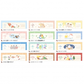 猫たちが季節の花々や風物詩と描かれている「ねころび」や愛らしい鳥たちが描かれている「さえずり」など、かわいらしい仕草の動物たちのカレンダーです。動物にちなんだ記念日が記載されています。