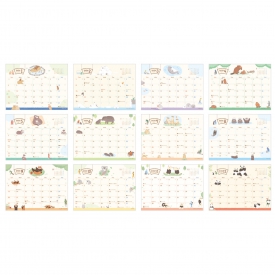 猫たちが季節の花々や風物詩と描かれている「ねころび」や愛らしい鳥たちが描かれている「さえずり」など、かわいらしい仕草の動物たちのカレンダーです。動物にちなんだ記念日が記載されています。
