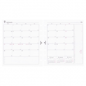 見開き1ヶ月のブロック式月間ダイアリーです。右端には小さく1ヶ月分の日付が縦に並んでいるので、曜日や1週間の区切りをを気にせずに一覧で見れます。(月曜日始まり)